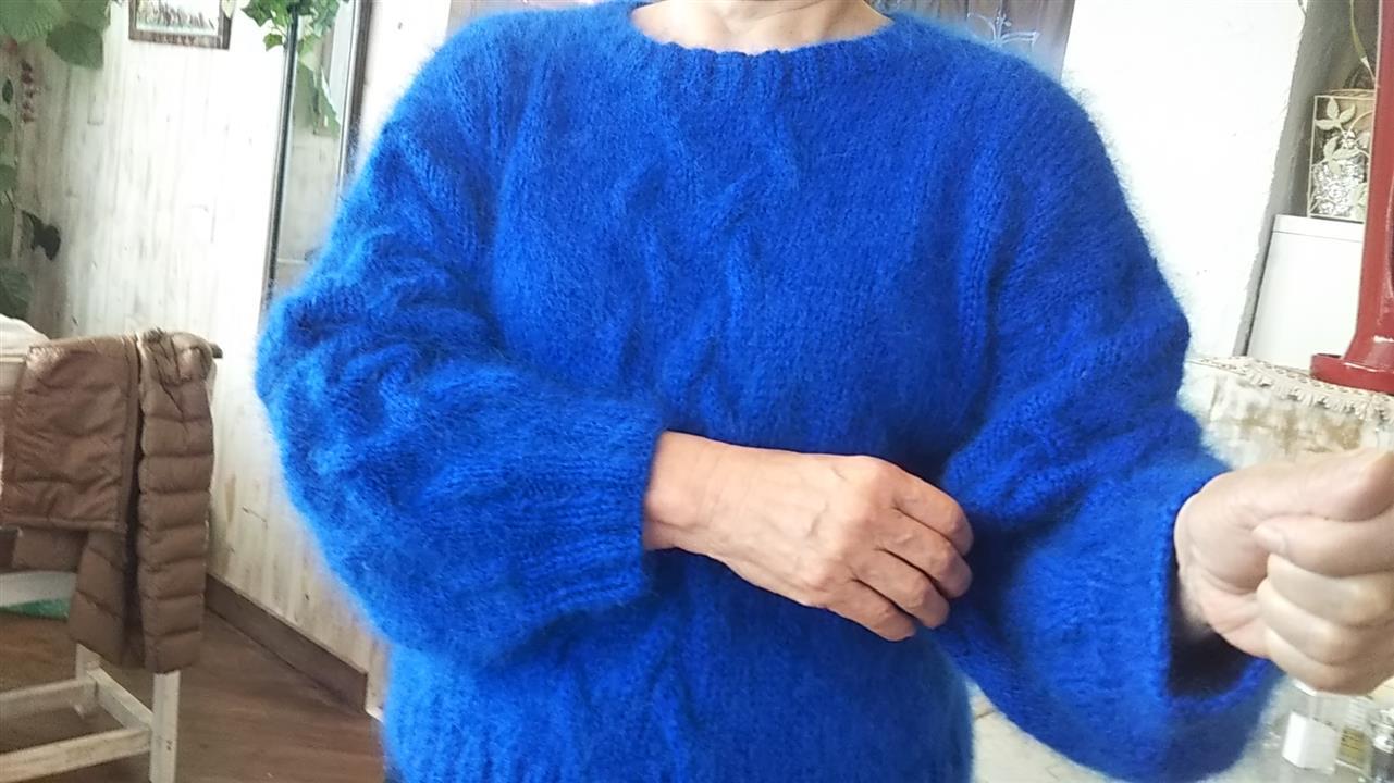 リノリホ教室Wさんの作品です鮮やかなブルーのふわふわセーター❗️上質モヘアで、ゴージャスですね🎵